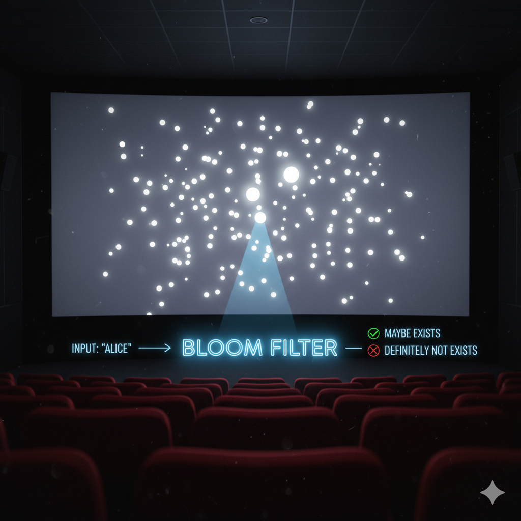 当“登记”一个字符串时,它经过几盏聚光灯(Hash 函数)的照射,同时在幕布的特定坐标上打下白点(置 1)。